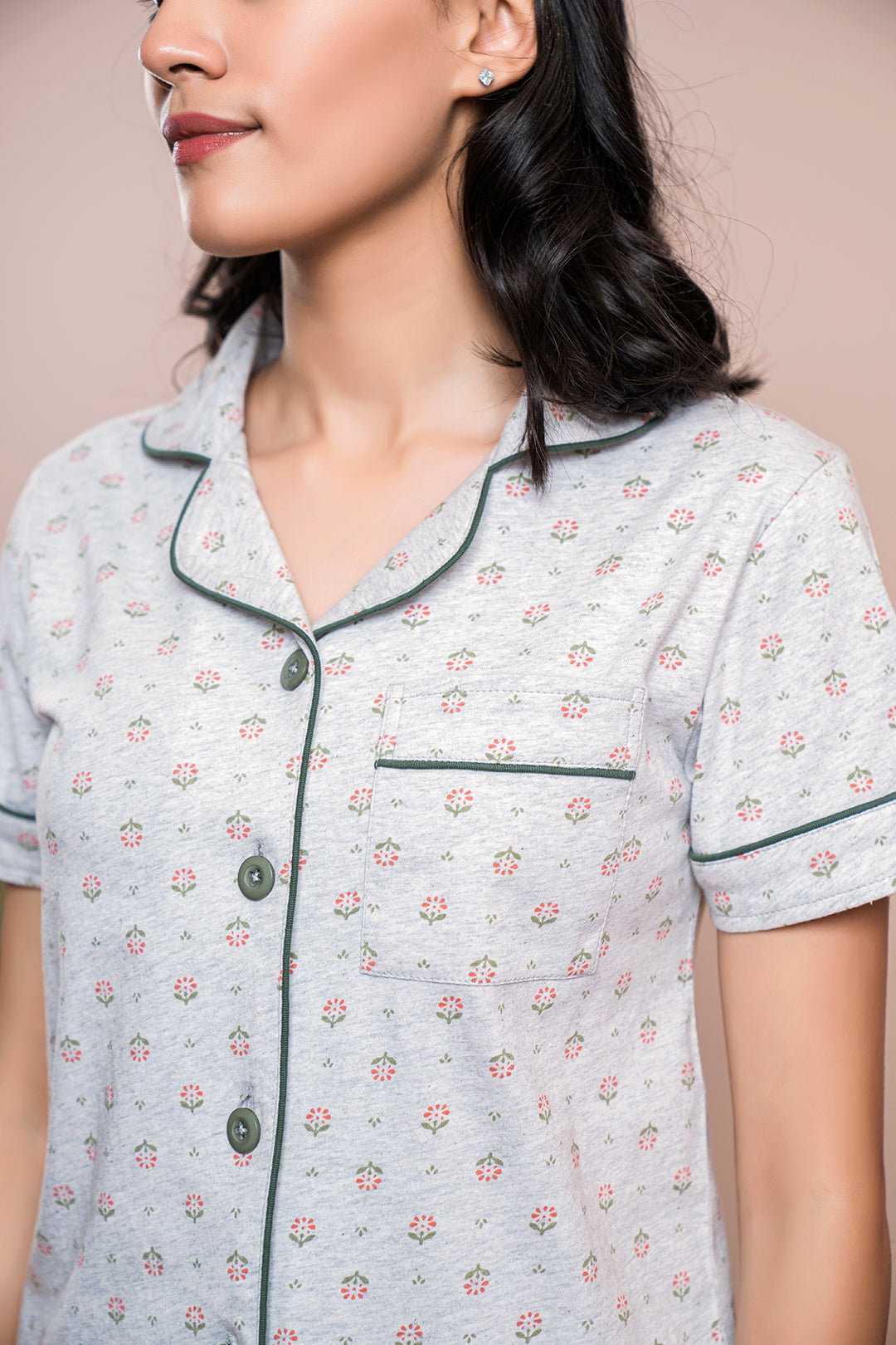 Get the utmost comfort and style by wearing this 100% cotton printed pajama suit as loungewear or sleepwear. This exquisite sleepwear is crafted with a luxurious fabric that is breathable and gentle on the skin, delivering a relaxing experience throughout the night. The eye-catching print adds a delightful touch, playfulness, and charm to your bedtime routine. This PJ set includes button-down collared shirts, half sleeves, a chest pocket, and elastic waistband pants for sung-fit comfort. Now you don’t have to compromise on your style on a lazy sunday morning; this cotton PJ set will submerge you in absolute ecstasy and timeless style.